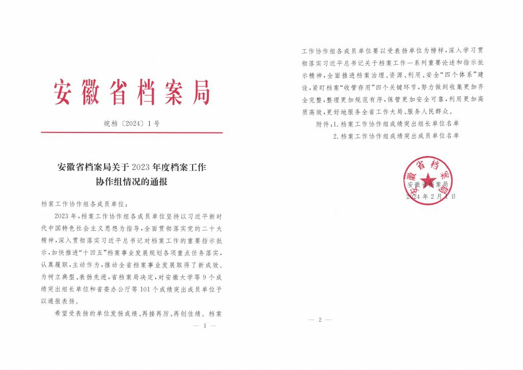 近日,安徽省档案局对全省2023年度档案工作协作组情况进行了通报,我院荣获档案工作协作组成绩突出成员单位。